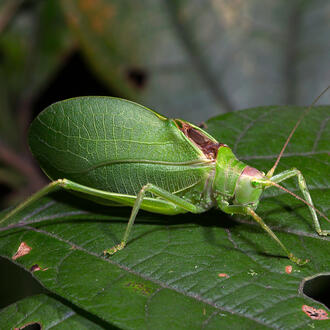 A katydid (Pterophylla camellifolia), which blends in easily with leaves due to its coloration and patterning